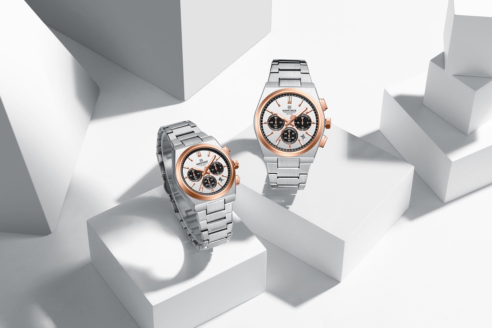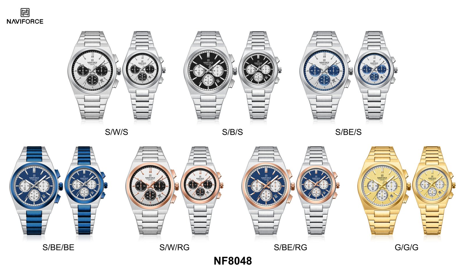 | Description: | The Naviforce NF8048 is primarily marketed as a Classic and Stylish Couples Watch Set (featuring a larger watch for men and a slightly smaller version for women). It is a quartz chronograph known for its integrated look and refined metal bracelet. |