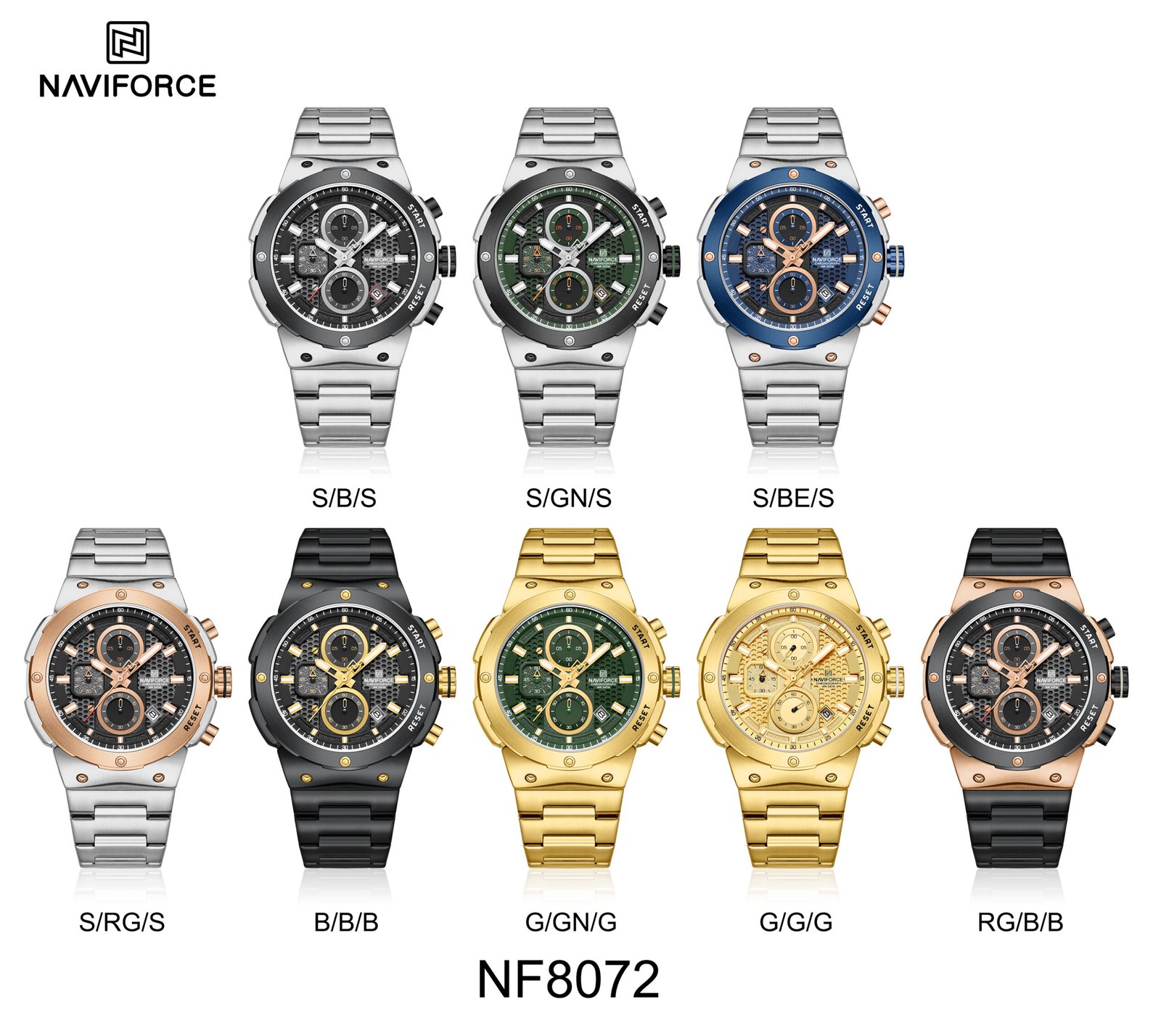 | Description: | The Naviforce NF8072 is a bold, multifunctional men’s quartz watch that draws inspiration from a mechanical aesthetic, despite being quartz-powered. It is characterized by its integrated bracelet design and strong, sporty look. |